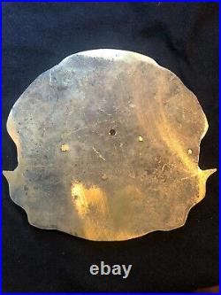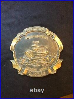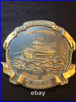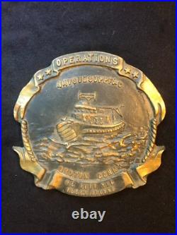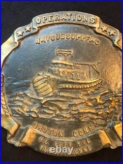 I have for sale a heavy metal plaque for the Naval Submarine Support Facility located at Groton, Connecticut. The plaque looks to be brass; it weighs almost four pounds and it’s in slightly circulated condition, see photos. Its diameter is 6 1/2 by 6 1/2 inches and 1/2 inch thick. I think this was attached to a building. The plaque reads OPERATIONS – NAVSUBSUPPFAC – GROTON CONN – WE PUSH THE – FLEET AROUND. In the center it shows a boat.