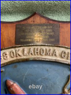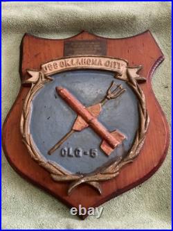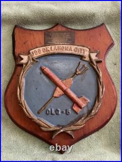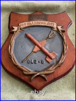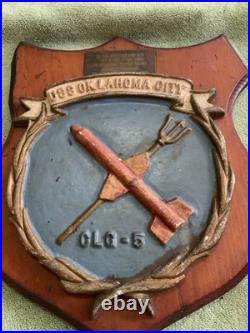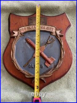 Crafted with the pride of a bygone era, this Vintage U. Navy USS OKLAHOMA CITY CLG-5 Alum/ Wood Wall Hanging Plaque is a tribute to the valiant spirit of naval history. The plaque features a detailed design that embodies the essence of the Navy’s legacy, making it an ideal piece for any collector or enthusiast of militaria. Measures about 13″x11″ overall plaque measures about 9″x8″, there is some damage to the ear of wood but still displays nicely. The combination of aluminum and wood adds a classic touch to this piece, ensuring it stands out as a decorative item or as a marker of respect for those who have served. Its robust construction and timeless appeal make it a perfect addition to any display of naval memorabilia or a distinguished gift for a veteran.