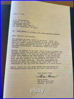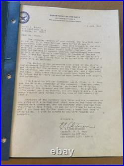 The sailor honored was SKGC Henry C. Dillion and he passed on 12 April 1988 following an outstanding Navy career and a long retirement. I don’t have much information on the sailor being honored but, the Captain of the USS Kansas City was a well known aviator who was Commander of Top Gun as well a member of the Blue Angels. You can read more about him below. There are (9) photos, (2) letters, a map of where the remains were laid, and a death certificate in this packet folder. Please review folder for details of this listing, review pictures provided and ask any questions before purchasing. Captain Ernest Edward Christensen, Jr. 13 February 1990 – 21 August 1991. Graduated from the Naval Academy in 1964. Was born in July 1942, in Annapolis, MD, the son of a career naval officer. Following graduation from the U. Naval Academy in June 1964, he entered flight training and received his wings in March, 1966, becoming the first third-generation Naval Aviator. His grandfather took part in the first trans-Atlantic flight in 1919. His father commanded the aircrafter carrier USS Hornet (CVS-12) in 1959-’60 and CarDiv-18 in 1962-’63. Following training in the A-4C Skyhawk aircraft in Lemoore, CA, Capt. Christensen Joined VA-113 and deployed in October, 1966 on the first of his four Vietnam combat cruises aboard USS Enterprise (CVAN-65). In August, 1968, after completing over 200 combat missions over North Vietnam and two cruises aboard USS Enterprise, he was reassigned for duty as an instructor pilot in A-7 aircraft in VA-174 at NAS Cecil Field, FL. In October, 1968, he was selected for duty as a pilot with the Navy Flight Demonstration Team, the Blue Angels. Following two years with the Blue Angels, he was transferred to duty flying the F-4 Phantom in VF-142. He completed two additional combat cruises in VF-142 between June 1971 and June 1973. In 1975, following a one-year tour as a student at the Naval War College, where he graduated with highest distinction, Capt. Christensen was ordered to the F-4 fighter training squadron, VF-121, as Operations Officer until screening for command in November, 1977. From April 1978 until June 1981, he served as Executive Officer and then Commanding Officer of VF-114, flying the F-14A Tomcat. Between July and November, 1981, he served as Operations Officer for Commander, Fighter Early Warning Wing, U. He was selected to command TOPGUN, the Navy Fighter Weapons School, in December, 1981. In August, 1983, he assumed command of CVW-2. He was ordered to the Pentagon in December, 1984, and served first as the Tactical Aircraft analyst, then Deputy Director and for four months as acting Director of the Office of Program Appraisal, the principal military staff advisor to the Secretary of the Navy. Detaching in August, 1986, and following six months of shipboard training, he commanded USS Kansas City (AOR-3) from April 1987 to January 1989. On February 13, 1990, Capt. Christensen became the 27th CO of USS Ranger (CV-61). Christensen has accumulated over 5000 hours in tactical aircraft and over 1000 carrier-arrested landings. He flew 360 combat missions over North Vietnam between 1966 and 1973. His awards include the Legion of Merit, 3 Distinguished Flying Crosses, the Meritorious Service Medal, 27 Air Medals.